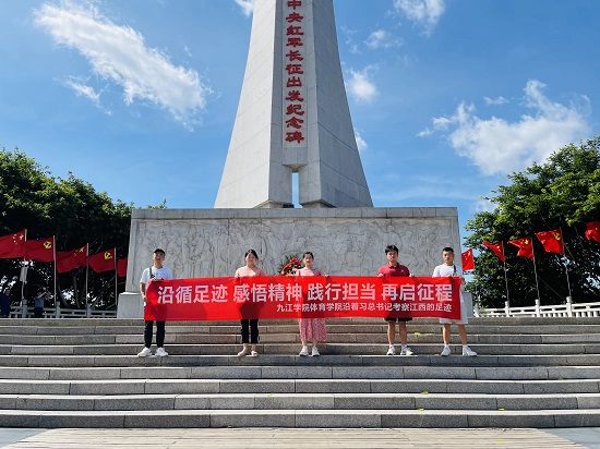 沿着习近平总书记的脚步,团队成员来到赣州于都县,走进中央红军长征出发地纪念园,在中央红军长征出发纪念碑前敬献花篮并重温入党誓词,汲取长征精神、缅怀革命先烈。在纪念园内一件件珍贵的文物,1934年中央红军在于都集结休整踏上万里长征的景象浮现在每个人的心间。同学们表示,铭记历史是为了继续前行,我们要讲好长征故事,以长征精神育人,让红色基因薪火相传。