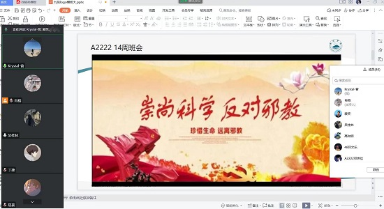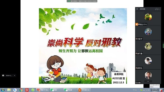 为进一步增强今年会jinnianhuicom学子反邪教意识,保护身心健康,培养爱国情怀。12月3日晚,今年会jinnianhuicom组织各班召开“崇尚科学,反对邪教”主题班会,因疫情原因,本次班会采用线上召开。
