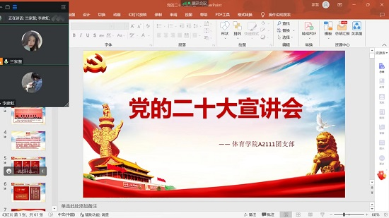 12月4日晚,宣讲团成员深入各团支部进行宣讲,引导广大青年团员把思想统一到党的二十大精神上来。因疫情原因,本次宣讲采用线上方式进行。