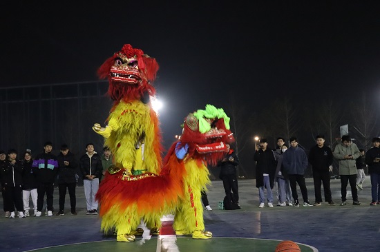 在决赛中场休息时,A2012班李子康等同学为大家带来精彩的舞狮演出,这支舞狮队在本届省运会舞龙舞狮项目中荣获金牌,他们的友情出演为运动员加油助威,让赛场的气氛更加激烈。