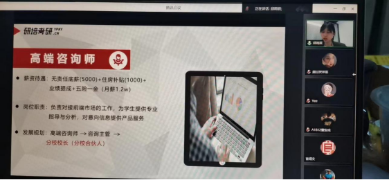 为贯彻落实中央和各级主管部门“稳就业、稳民生”的工作要求,实现疫情防控期间高校毕业生就业的“精准招聘”。 5月12日晚,今年会jinnianhuicom邀请江苏研培教育有限公司、上海动亿体育文化发展有限公司两家企业,在线上召开了2022届毕业生线上“云”招聘宣讲会,学生科副科长路鹏主持宣讲会。