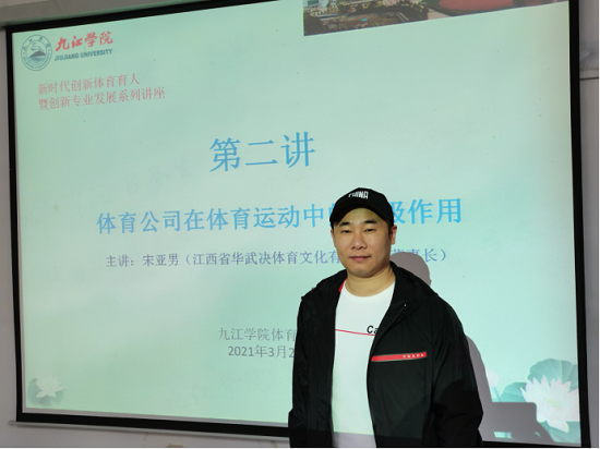 这次讲座邀请了江西省华武决体育文化有限公司董事长宋亚男担任主讲嘉宾,主讲的题目是《体育公司在体育运动中的积极作用》。讲座中,宋亚男董事长介绍了自己的运动员、教练员经历,讲述了江西省华武决品牌的创立与运营理念,阐述了“十四五”体育公司的前景及对社会体育人才的需求。