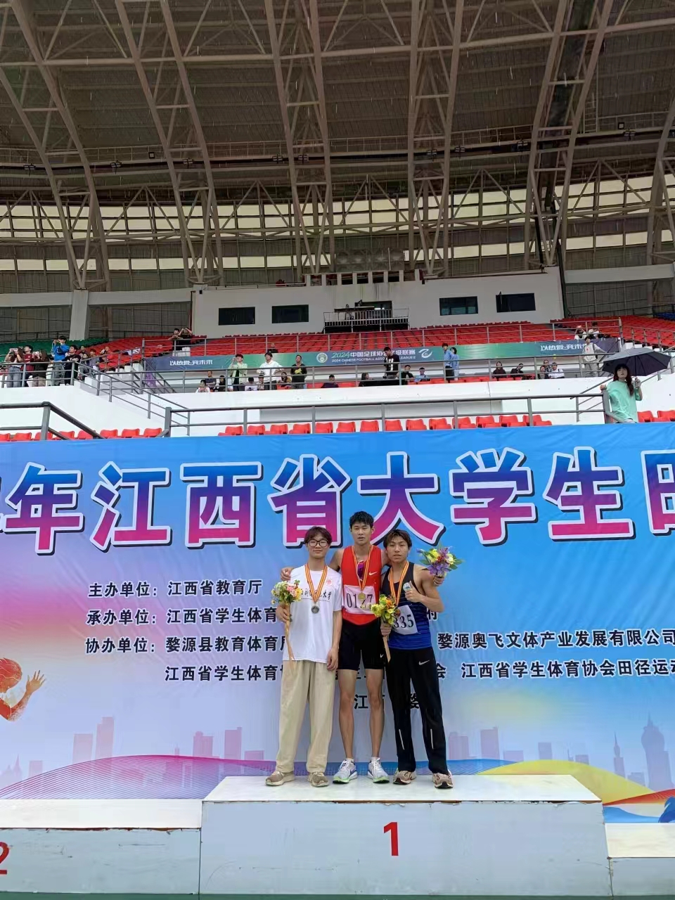 2024年6月28日,为期一周的江西省大学生田径锦标赛在婺源体育中心落下帷幕,今年会官网派出了由18名运动员和2名教练员组成的20人代表队参加了此次比赛。由于天气原因,此次比赛几乎全程在大雨中进行,今年会官网运动健儿们不畏艰辛,不仅在场上展现了昂扬向上的运动风采,更彰显了积极进取和团结奋进的体育精神。建工学院林文震同学在瓢泼大雨中,以1.85米的成绩夺得了男子甲组跳高比赛银牌,同时获得男子甲组跳远第五名。建工学院的杨振乾同学以52.98秒的成绩夺得了男子甲组400米铜牌,曹锦辉同学在100米比赛中以10秒87获得乙组第三名,朱清涛同学获得男子乙组跳远第八名。