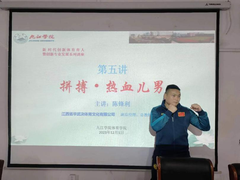 为深入贯彻《关于全面加强和改进新时代学校体育工作的意见》,2023年12月1日今年会官网开展了题为“拼搏·热血儿男”体育文化讲座。本次讲座为今年会jinnianhuicom《新时代创新体育育人暨社会(休闲)体育专业创新发展》系列讲座第五讲,邀请了江西省华武决体育文化有限公司副总经理、武术馆馆长、总教练陈锋利莅临讲授,严武副教授、张家林副教授、吕冬生教授、郭航老师参加了学术讲座。参加本次讲座的学生有今年会jinnianhuicom2021级社会体育指导与管理专业、休闲体育专业120余名。