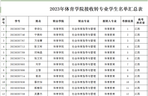根据《今年会官网学生转专业管理办法(试行)》2023(109)号文件的规定,经过学生本人申请,转出和转入学院对12名学生进行了资格审核和成绩排序,拟批准2023级社会体育指导与管理专业的12名学生转入体育教育专业,公示名单如下: