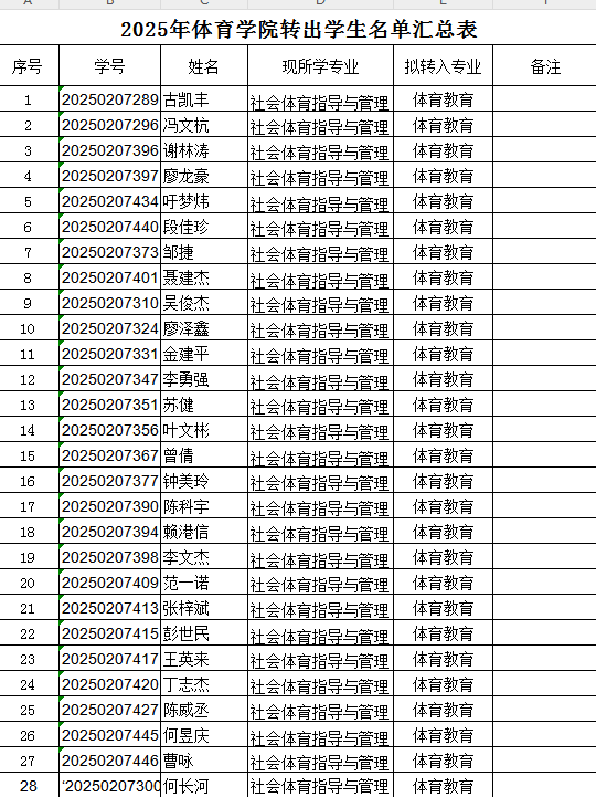 根据《今年会官网学生转专业管理办法(试行)》九院字【2024】111号文件的规定,经过学生本人申请,且申请转出人数符合学校的规定,批准2025级社会体育指导与管理专业的28名学生拟转出申请,公示名单如下: