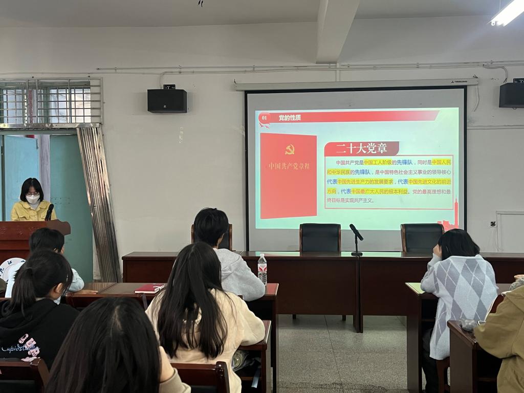 10月25日下午,培训班邀请外国语学院组织员程洁老师讲授题为《党的基本知识》的专题辅导党课。她详细讲述了党的性质、指导思想、根本宗旨、纲领、党员的义务和权利等党的基本知识。辅导结束后,学员们集中观看了时政纪录片《诺言》、《迈向现代化强国的发展密码》。