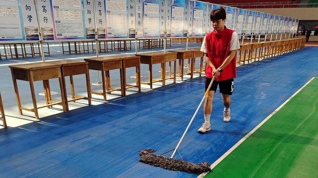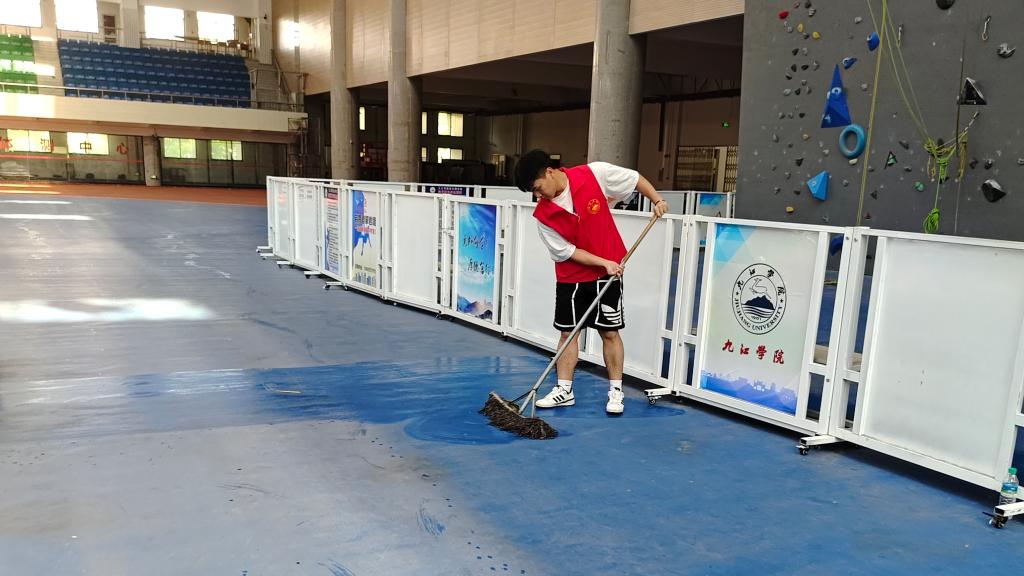 学校北区体育训练中心历经重修,存在大量的建筑垃圾和灰尘,10名志愿者在场馆工作人员的带领下开展清扫志愿服务活动,大家分工明确,相互协作,拿着清洁工具,仔细地清扫着场馆的每一个角落,从地面到看台,不放过任何一处灰尘和杂物,充分展现了团队的力量。