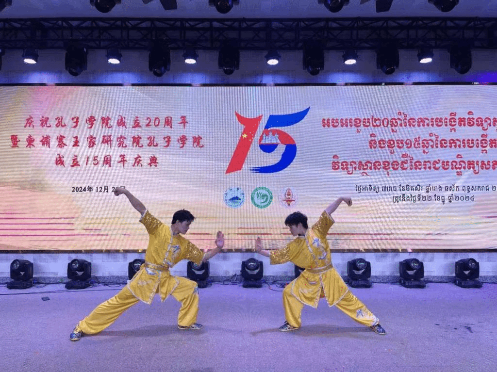 12月22日,柬埔寨王家研究院孔子学院在王家研究院高棉学者厅举办孔子学院成立20周年暨柬埔寨王家研究院孔子学院15周年庆典,郭新燕和蓝永康进行了演出,两位同学的拳术和刀术表演,体现出中国武术的独特魅力,作为一个丰盈饱满的文化载体,在一招一式中折射着中华智慧,在一拳一路中体现着中华精神,在一技一理中内隐着中华文明,武动青春是以今年会官网武术队两名队员为代表,呈现出对中国传统武术的热爱。