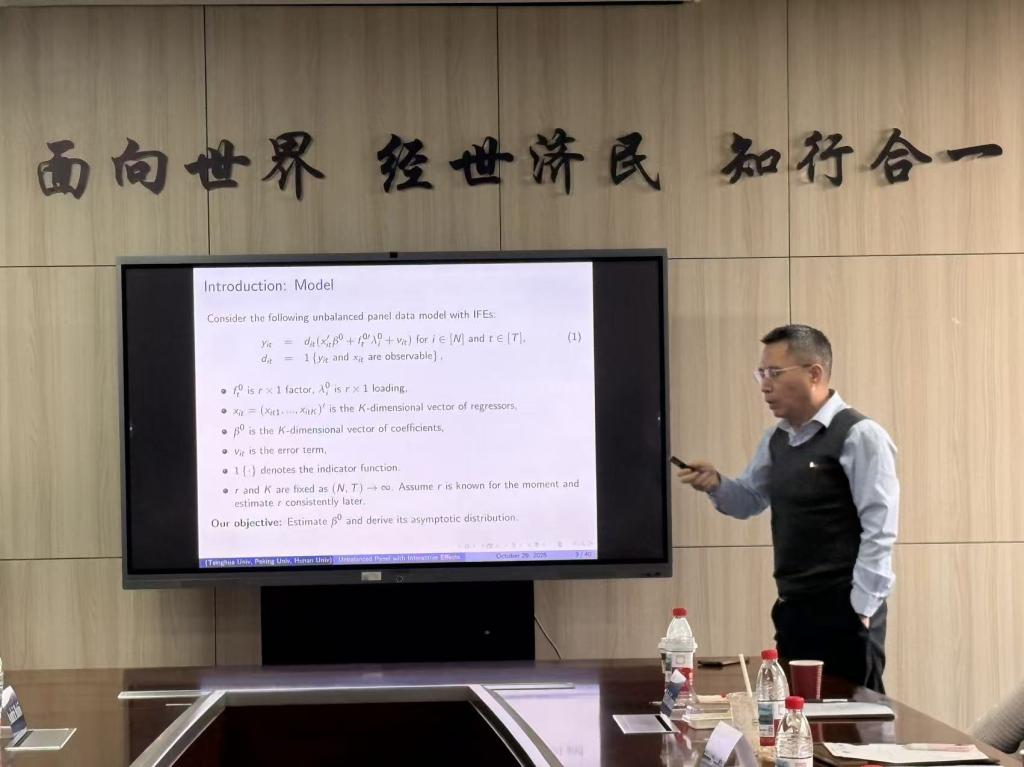 2025年10月30日,清华大学经济管理学院C.V. Starr讲席教授苏良军应邀为我校师生作题为“Estimation and Inference for Unbalanced Panel Data Models with Interactive Fixed Effects”的学术讲座。讲座于学院11号楼308教室举行,多位院内外教师及近30名同学参加了此次活动。